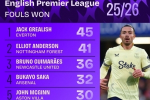 英超造犯规榜:格拉利什压安德森居首,萨卡、若昂·佩德罗在列