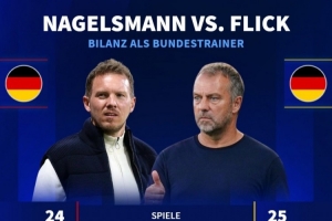 截止昨天的比赛,纳格尔斯曼已经执教 style='color:red;' href=/qiudui/zuqiu/224.html>德国队24场比赛,战绩为12胜6平6负20个净胜球。而弗里克从2021-2023年总计执教 style='color:red;' href=/qiudui/zuqiu/224.html>德国队25场,战绩为12胜7平6负30个净胜球。