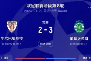 体育资讯01月29日讯 欧冠联赛阶段末轮, style='color:red;' href=/qiudui/zuqiu/248.html>葡萄牙体育客场3-2逆转战胜 style='color:red;' href=/qiudui/lanqiu/12093.html>毕尔巴鄂,最终排名第七直通欧冠16强。