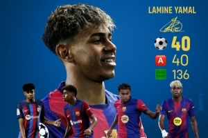 40球40助!18岁亚马尔为巴萨出战136场比赛参与80球
