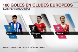 数据统计显示,路易斯·迪亚斯在旅欧期间俱乐部赛事已经打进了100粒进球,其中 style='color:red;' href=/qiudui/zuqiu/389.html>波尔图41球, style='color:red;' href=/qiudui/zuqiu/54.html>利物浦41球,拜仁18球。