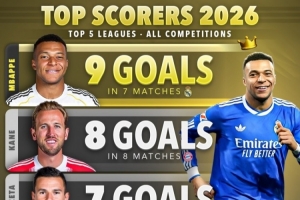 体育资讯2月10日讯 Score90统计了五大联赛球员2026年各赛事的进球数量,并列出2026年进球榜, style='color:red;' href=/qiuyuan/zuqiu/45.html > style='color:red;' href=/qiuyuan/zuqiu/376.html > style='color:red;' href=/qiudui/zuqiu/6836.html>姆巴佩7场9球居首。
