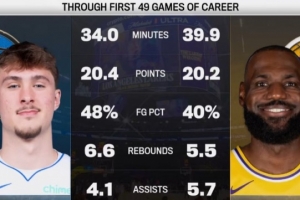 不遑多让!生涯前49场弗拉格场均20.4分6.6板 詹姆斯20.2分5.7助