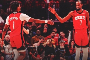 赛后, style='color:red;' href=/qiudui/lanqiu/2.html>火箭官方晒出本场赢球海报,封面为杜兰特与阿门·汤普森的击掌瞬间。