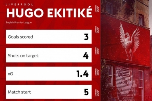 埃基蒂克加盟利物浦以来5场英超皆首发,射正4次打进3球