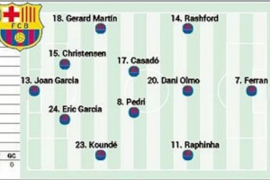 阿斯预测巴萨首发:奥尔莫在列,拉什福德、费兰、拉菲尼亚三叉戟