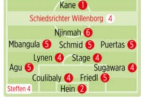 体育资讯9月27日讯 德甲第5轮比赛,拜仁主场4-0击败 style='color:red;' href=/qiudui/zuqiu/131.html>不莱梅, style='color:red;' href=/qiudui/zuqiu/224.html>德国媒体《图片报》为两队球员评分,若纳坦-塔、 style='color:red;' href=/qiuyuan/zuqiu/302.html >凯恩、迪亚斯1分最高。