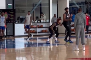 体育资讯10月15日讯 在今天的 style='color:red;' href=/qiudui/lanqiu/28.html>76人队内训练中, style='color:red;' href=/qiudui/zuqiu/1547.html>恩比德与队友轮流进行一对一的单挑。