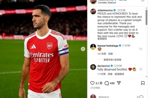 style='color:red;' href=/qiuyuan/zuqiu/350.html >梅里诺写道:“自豪与荣幸!今晚能有机会作为队长代表这家俱乐部和这群球员出战,感觉难以置信。感谢所有人的留言和支持,没有比用一场胜利和晋级下一轮更好的方式来庆祝了,枪手加油!🤍❤️💪🏽”