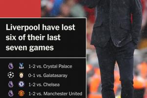 style='color:red;' href=/qiudui/zuqiu/54.html>利物浦各项赛事近7场6败,联赛杯出局、止步16强,英超落后榜首7分。上赛季的耐考王如今节节退败。