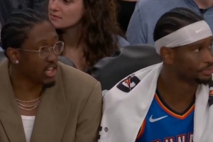 比赛最后时刻,镜头给到板凳席上的 style='color:red;' href=/qiudui/lanqiu/1.html>雷霆众将,亚历山大和仍在养伤的杰伦·威廉姆斯神同步。