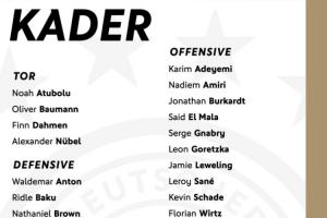 进攻端:阿德耶米(多特)、阿米里( style='color:red;' href=/qiudui/zuqiu/129.html>美因茨)、伯卡特( style='color:red;' href=/qiudui/zuqiu/126.html>法兰克福)、马拉( style='color:red;' href=/qiudui/zuqiu/140.html>科隆)、格纳布里(拜仁)、 style='color:red;' href=/qiudui/zuqiu/3710.html>格雷茨卡(拜仁)、勒威林( style='color:red;' href=/qiudui/zuqiu/132.html>斯图加特)、萨内( style='color:red;' href=/qiudui/zuqiu/5677.html> style='color:red;' href=/qiudui/zuqiu/9493.html>加拉塔萨雷)、沙德( style='color:red;' href=/qiudui/zuqiu/67.html>布伦特福德)、 style='color:red;' href=/qiuyuan/zuqiu/309.html >维尔茨( style='color:red;' href=/qiudui/zuqiu/54.html>利物浦)、沃尔特马德(纽卡)