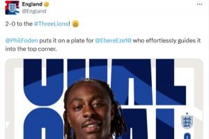 style='color:red;' href=/qiudui/zuqiu/234.html>英 style='color:red;' href=/qiudui/zuqiu/8881.html>格兰官方在播报进球时写道:“三狮军团2-0领先!福登将球喂到嘴边,埃泽毫不费力地将球送入上角。”