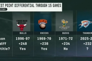 雷霆本赛季前15场净胜对手232分 历史第4多&前三球队有两支夺冠