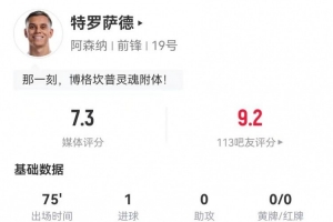 特罗萨德本场1球+1助攻 4过人0成功+17丢失球权 2抢断2造犯规