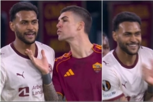 体育资讯11月28日讯 据《 style='color:red;' href=/qiudui/zuqiu/157.html>罗马体育报》报道, style='color:red;' href=/qiudui/zuqiu/157.html>罗马后卫曼奇尼在本轮欧联杯比赛中用飞吻挑衅对手。