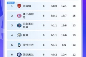6轮过后, style='color:red;' href=/qiudui/zuqiu/56.html>阿森纳6战全胜领跑,基本锁定前8席位, style='color:red;' href=/qiudui/zuqiu/51.html>曼城升至第4, style='color:red;' href=/qiudui/zuqiu/1991.html>本菲卡两连胜靠近附加赛区,重燃晋级希望。